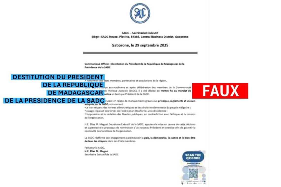 Depuis le 29 septembre 2025, un document présenté comme un communiqué officiel de la Communauté de développement de l’Afrique australe (SADC) circule massivement sur les réseaux sociaux. Ce texte affirme que l’organisation régionale aurait décidé de « destituer le Président de la République de Madagascar de la Présidence de la SADC ». Après vérification, il s’avère que cette déclaration est totalement fausse.