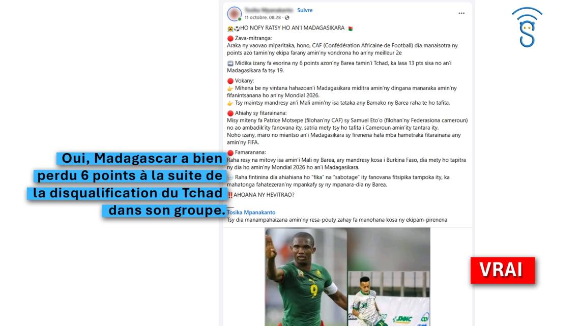 Des affirmations circulent sur les réseaux sociaux selon lesquelles des points auraient été retirés à Madagascar dans le cadre des éliminatoires de la Coupe du monde de football.