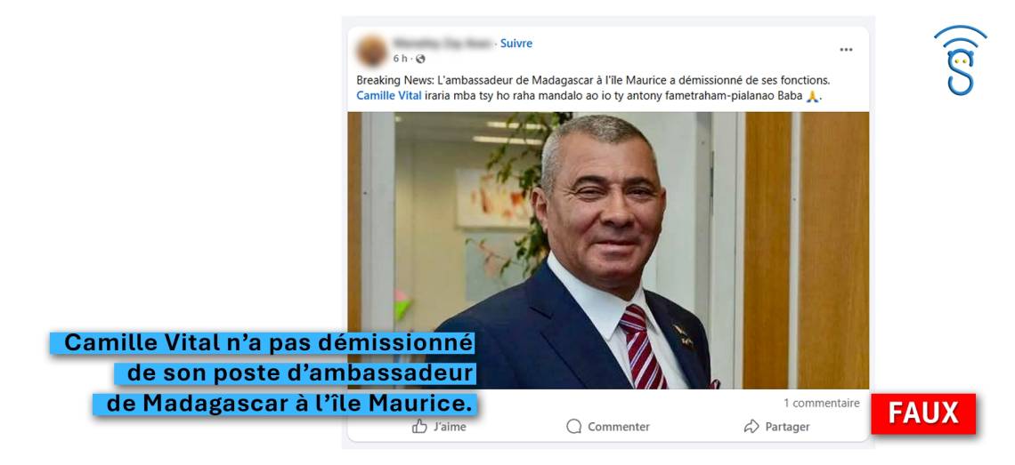 Verdict : Faux — Camille Vital n’a pas démissionné de son poste d’ambassadeur de Madagascar à l’île Maurice. La rumeur diffusée en ligne repose sur une fausse information.