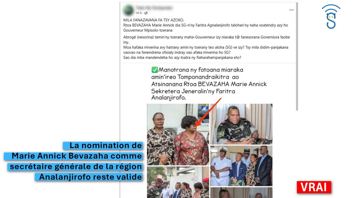 Des publications sur les réseaux sociaux affirment que Marie Annick Bevazaha est redevenue secrétaire générale de la région Analanjirofo, sans qu’un nouveau décret de nomination n’ait été pris.