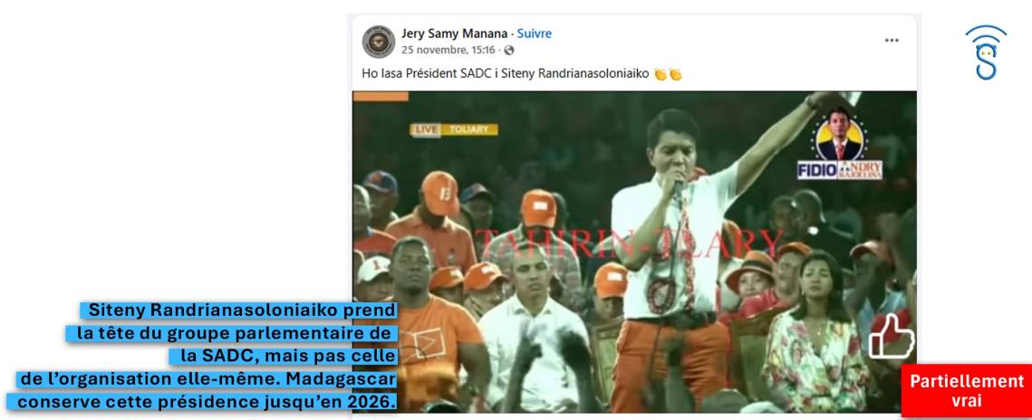 L’information est partiellement vraie. Il est inexact de dire que le président de l’Assemblée nationale malgache prend la tête de la SADC elle-même. En revanche, il occupe bel et bien une nouvelle fonction au sein de l’organisation : Siteny Randrianasoloniaiko devient président de la Réunion des parlementaires de la SADC. Il a annoncé cette nomination publiquement hier, lors de la deuxième session ordinaire de l’Assemblée. Selon les informations disponibles, il prêtera serment pour ce poste le 26 novembre.